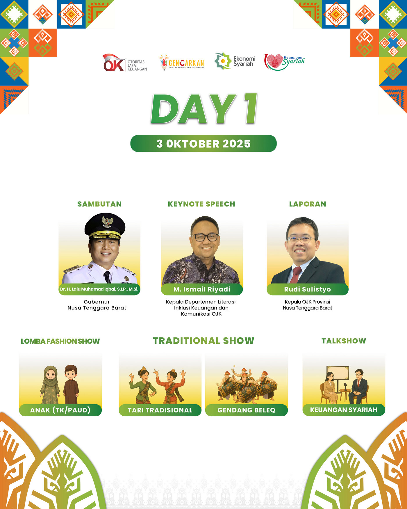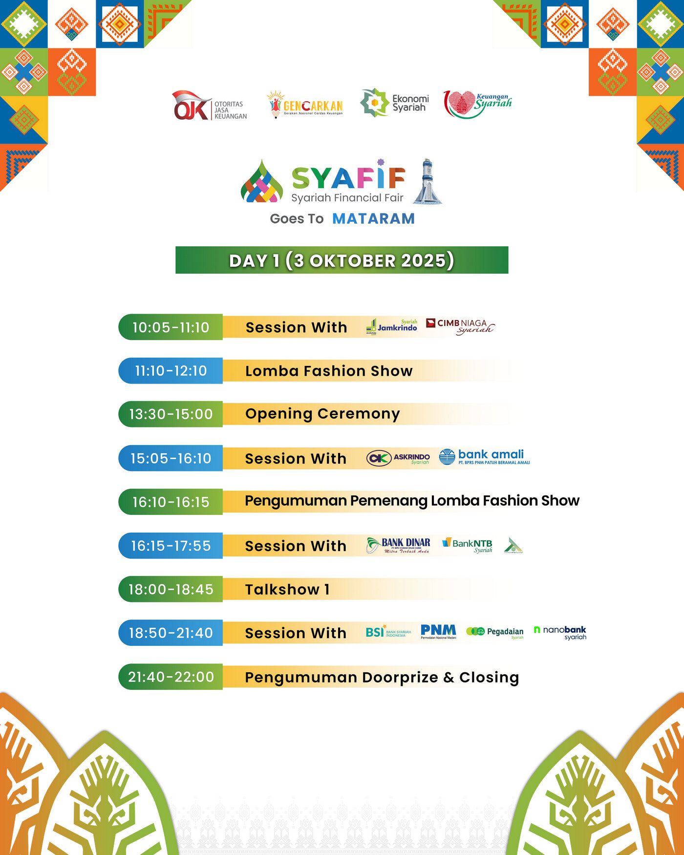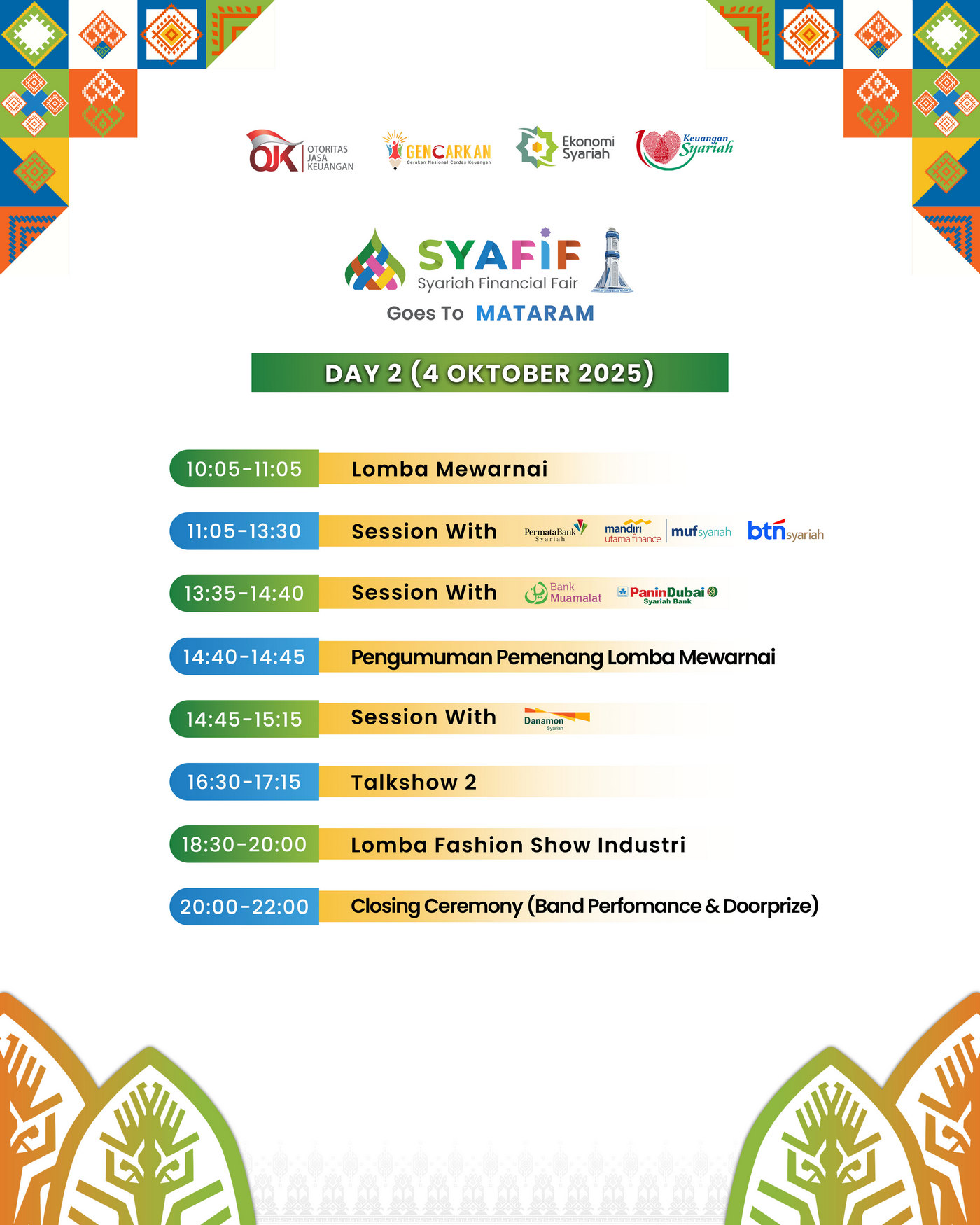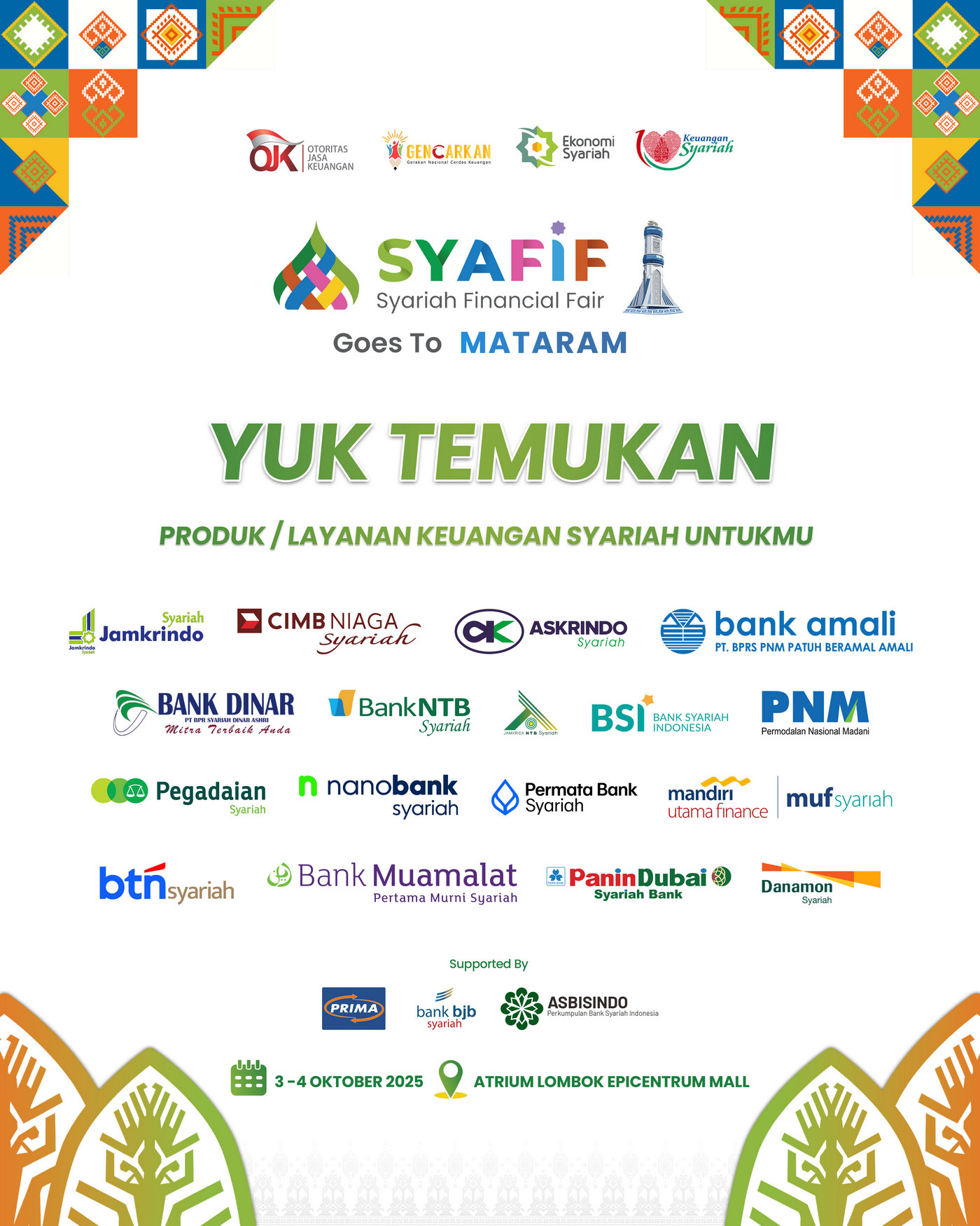3 - 4 Oktober 2025Atrium Lombok Epicentrum MallPameran Jasa & Produk Keuangan Syaraiah, Talkshow & Edukasi, Band Performance, Fashion Show, Lomba Anak dan Door Prize!!